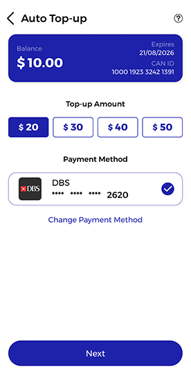 | Source of Funds | You can use Mastercard, Visa or your bank account (GIRO) as your Source of Fund (SOF). If you are using GIRO for your Auto Top-up, you will have to pay a $2 admin fee if the deduction fails. |