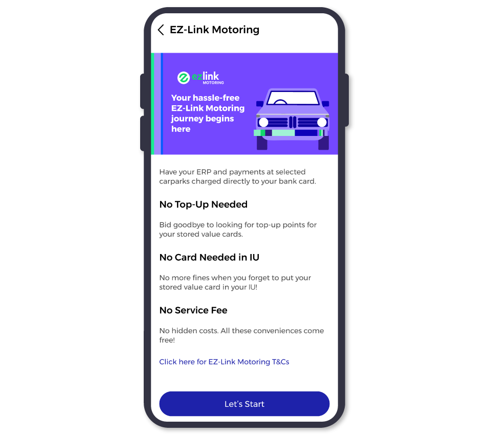 With the EZ-Link Motoring service, you can charge your ERP and carpark fees directly to your locally issued Mastercard or Visa card, so you won’t need to top up your physical card. You can also track transactions through the service.