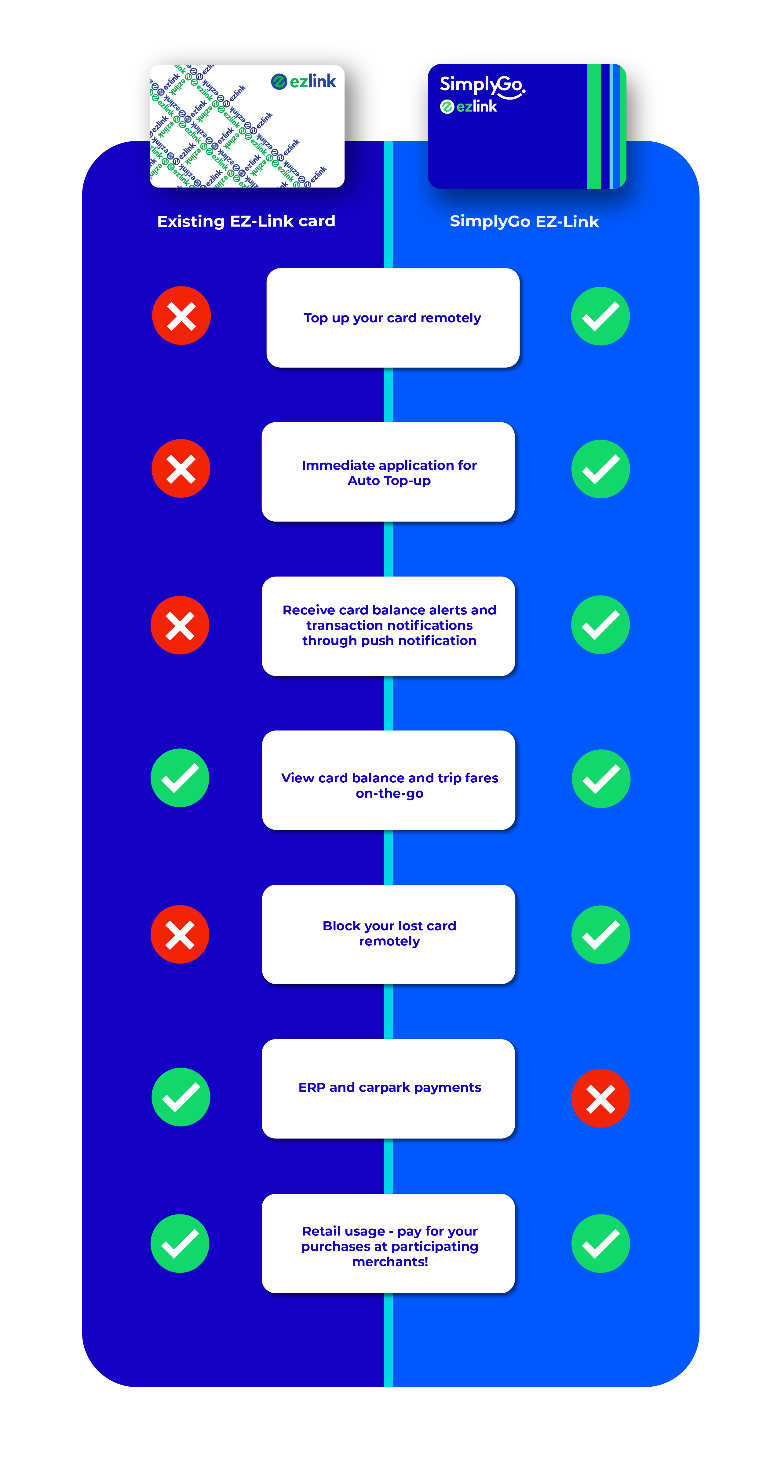 With EZ-Link making the move to SimplyGo, you will be able to use your existing EZ-Link cards and charms while enjoying their benefits.